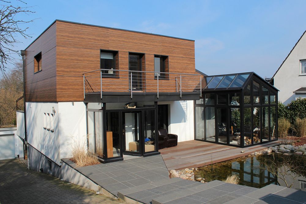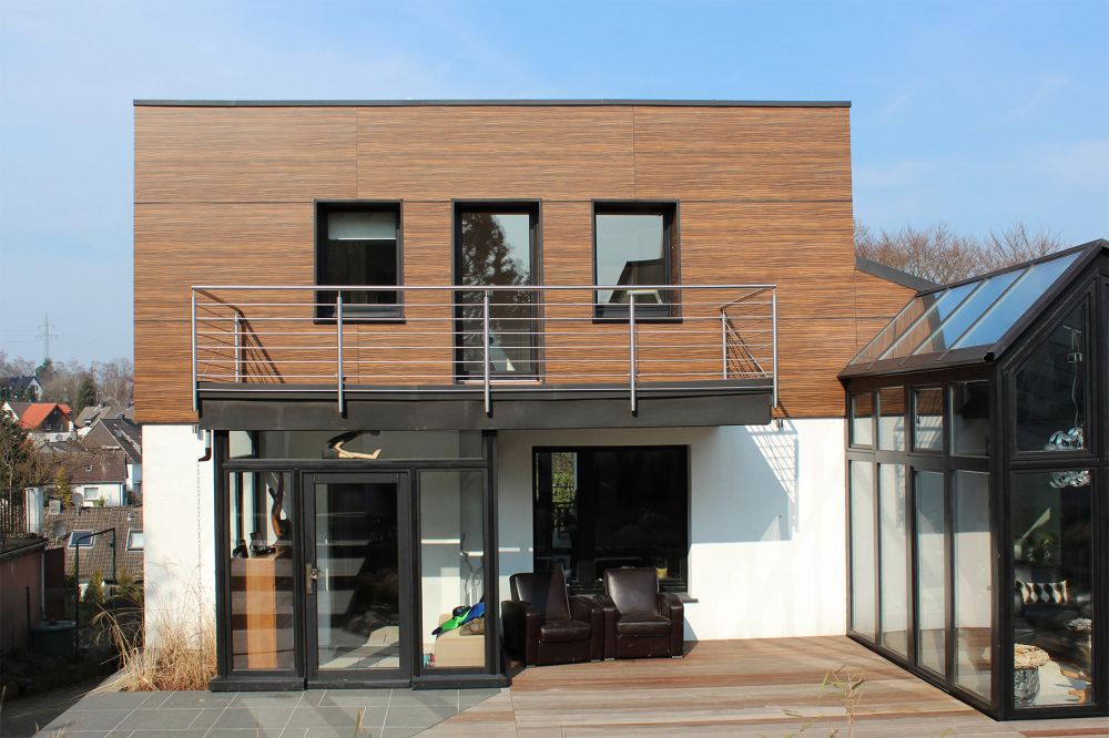 Nach Erörterung verschiedener Entwurfsvarianten entschied man sich für den Abbruch des steilen, traditionell mit Schiefer verkleideten Satteldachs. Im Gegenzug wurde ein vollwertiges, mit einem Flachdach versehenes Obergeschoss errichtet, das nun viel Raum für drei Kinderzimmer und ein modernes Bad bietet. Die vorgehängte Fassade mit ihren großformatigen Kunststoffverbundplatten verleiht dem Gebäude ein modernes Erscheinungsbild. Durch die hochwertig gedämmten neuen Bauteile und die Erneuerung der vorhandenen Heizungsanlage, zusätzlich mit Solarthermie auf dem neuen Dach versehen, konnten beträchtliche Energieeinsparungen erreicht werden.